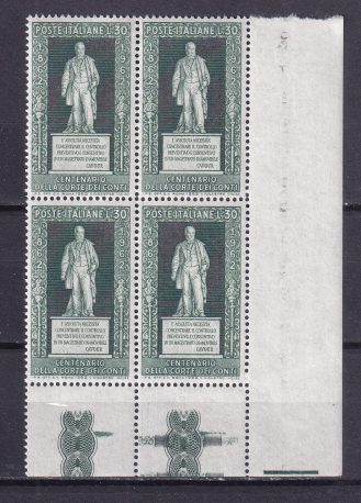 Repubblica italiana 1962 – Centenario Ordinamento della Corte dei Conti – Quartina valori nuovi Mnh angolo di foglio